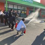 また八幡消防署から職員2名が来ていただき、訓練用の水消火器を使っての消火器実技も実施しました。